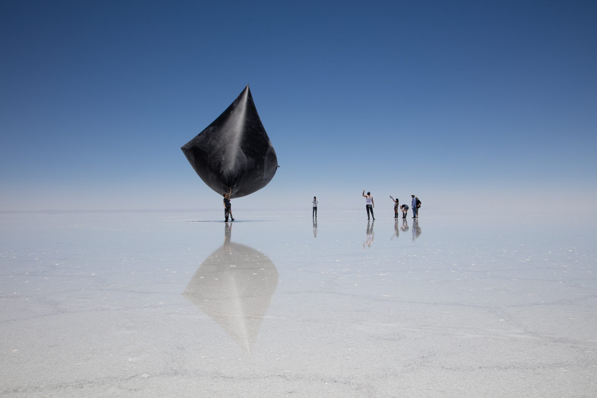 GO. In previous works you’ve made reference to Membrane Theory, according to which any modification to a surface provoked by agents—in this case human beings (i.e., visitors to the exhibition)—generates a deformation, a curvature, an alteration in space and time. In an amazingly precise way, this formal analogy in your pieces alludes to the notion of cause and effect, and how that which is generated by some has effects on others. However, at the Salar de Uyuni, the surface is inescapably flat. Is there some analogy with Membrane Theory here?