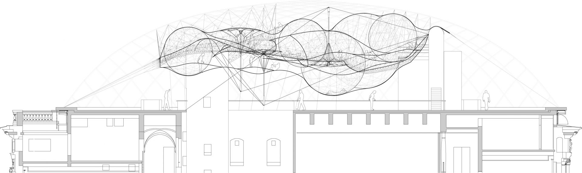 The installation appears as a surreal landscape: an ocean of clouds and floating planetary bodies. The physically accessible work is constructed of near-transparent steel mesh that interlaces three levels spanning the glass dome’s immensity. Five air-filled spheres open the layers of the net structure that encompasses an area of 2500 square metres.