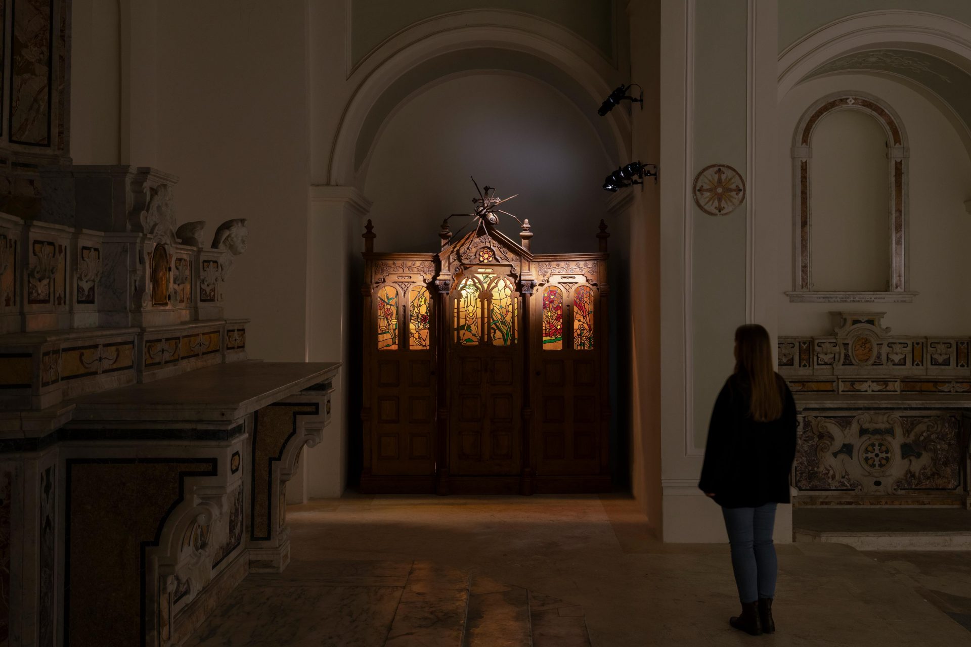 In 2023, in the Chiesa Madonna del Carmine – Palazzo Lanfranchi in Matera, a Catholic confessional box is found, in which spider/webs emerge in the place of the priest, with the intention to share their ancestral wisdom. It’s a call to humanity, one to listen closely to: “we have lived on Earth for more than 380 million years, while most of you humans, merely 200 thousand years… we invertebrates represent 95% of all animals on planet Earth, yet we are threatened by extinction, something that would endanger all lives on earth. We ask you to care for the rights of our webs of life. Weaving together ways of living, with lifestyles that do not affect climates, for more just, eco-social inter- intra-species societies for all?