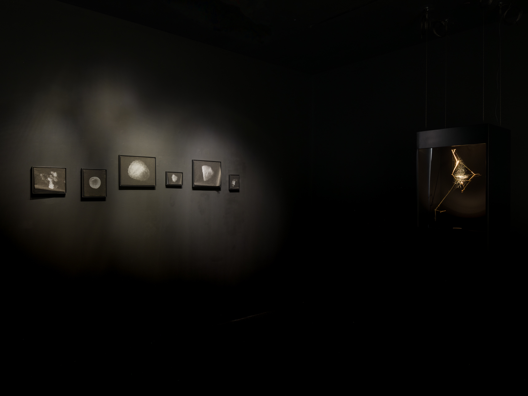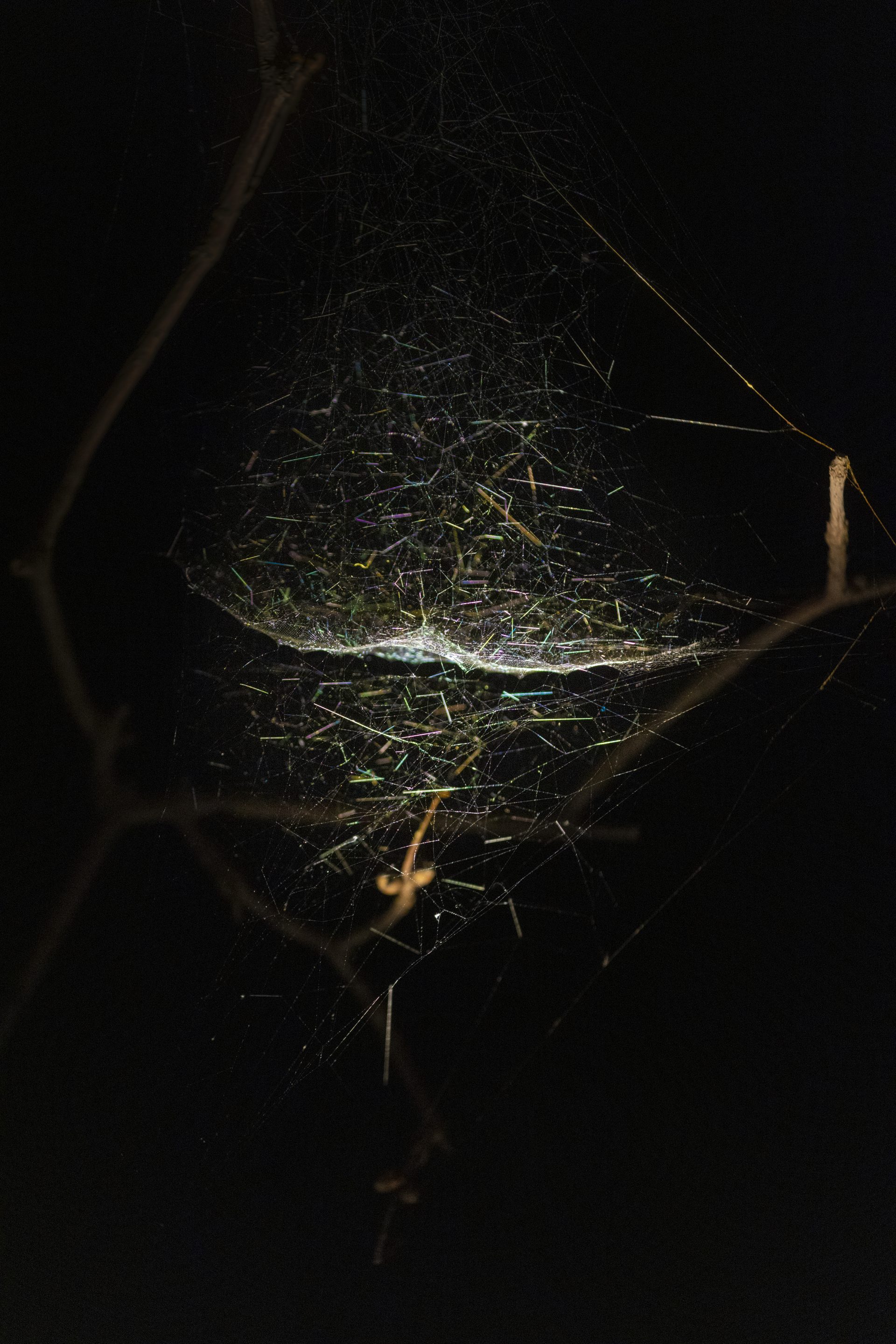 A final gallery contains works that delve more deeply into Saraceno’s collaborative work with spiders. Beginning almost two decades ago, this project has led to the formation of Arachnophilia: an interdisciplinary, distributed and intercultural community that syncretizes artistic, scientific and situated knowledges through a shared affinity to spider/webs. This darkened gallery includes works woven in authorship by and with spiders that live alongside the artist at his studio in Berlin, Germany. By showcasing the meshwork of spider webs the artist hopes to encourage those who experience a fear of spiders (arachnophobia) to move toward a love and wonder of them (arachnophilia). More importantly, this ongoing exploration functions as both model and metaphor, celebrating extra-human technologies of sensing, and settlement, offering a more sensitive, collaborative way of life on Earth.