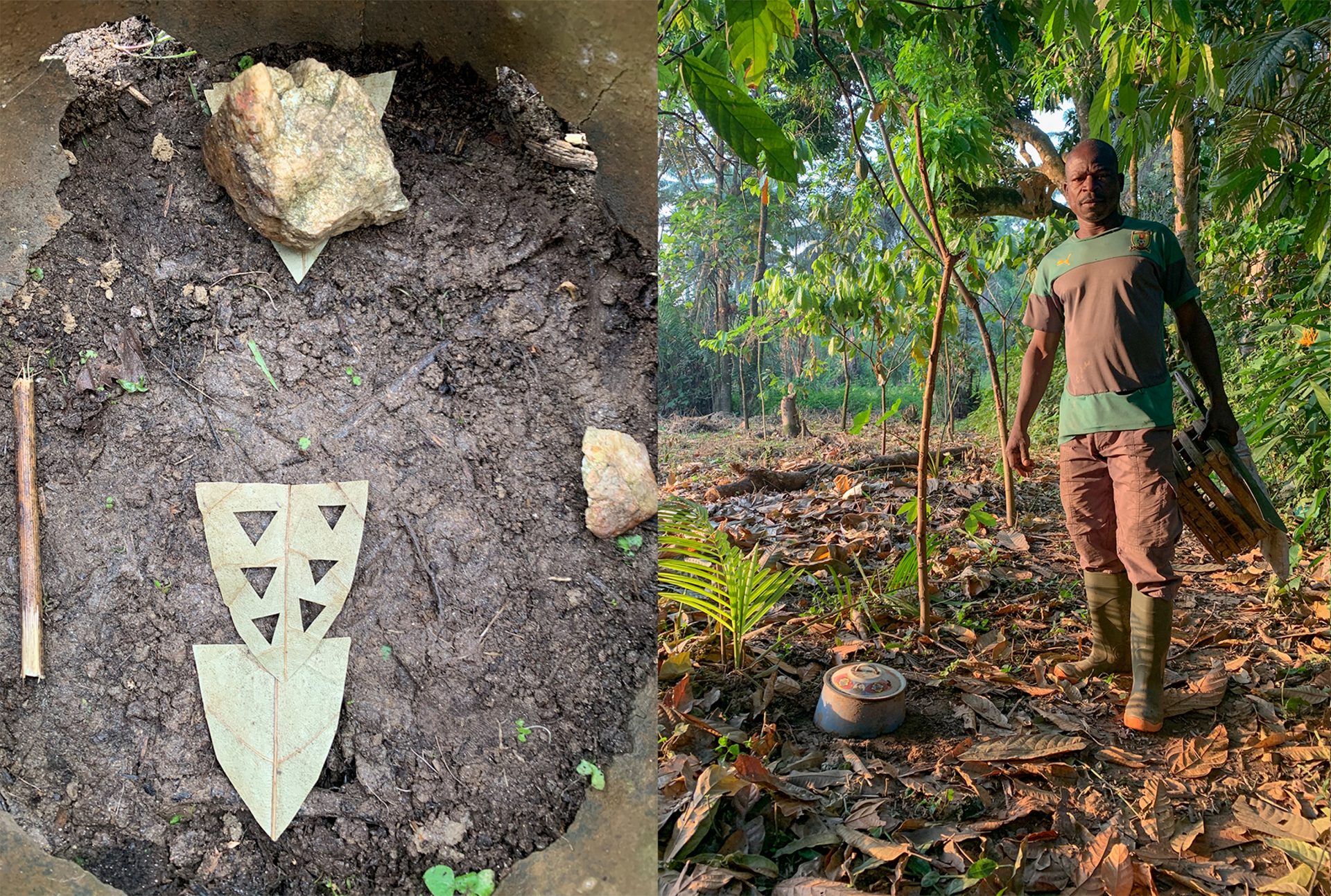 “Hello. I am a Cameroonian citizen. I live in Somié. I divine together with the ŋgam dù, the spider that lives in the ground, using leaves cut out with a series of symbols. So if you have a problem… you call me! I’ll consult the spider, and I’ll ask her your question. I work with a friend, my friend [Iréné Nguea], who films what I do with the spider. He can send you the result of the consultation as a film. So if you want to know more, check out our website: nggamdu.org”