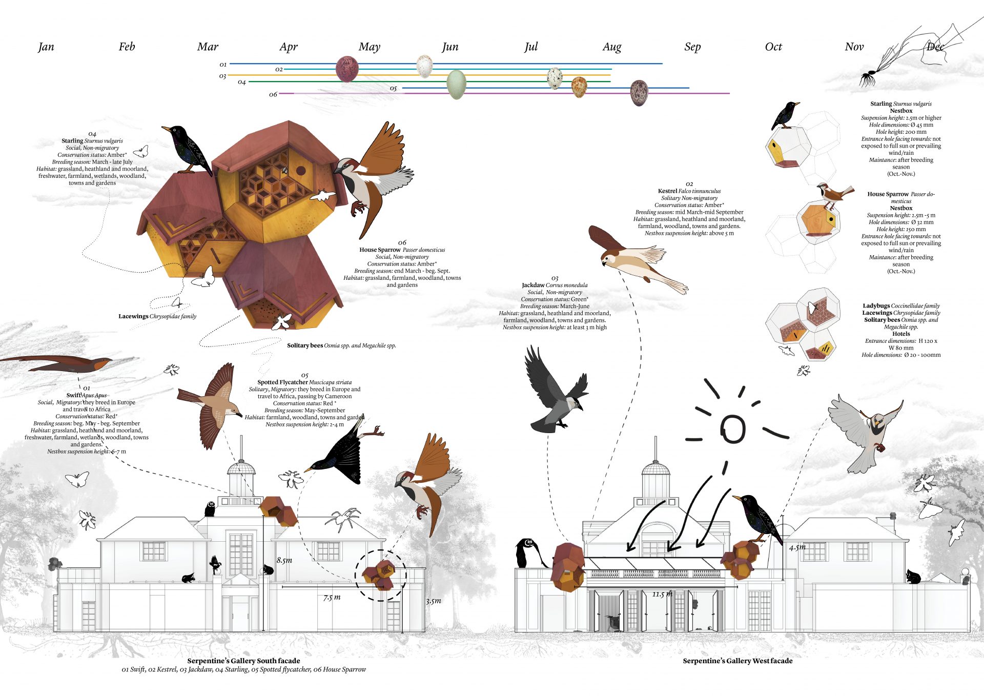 Cloud Cities: Species of Spaces and Other Pieces*, is a series of new sculptures installed inside the gallery, on the roof of the building and within the park. Developed in consultation with ornithologists and wildlife organisations, the sculptures provide specially-designed habitats for a range of animals, both native species and visitors to the park, some of which are in decline or in danger of extinction. The sculptures stand as meditations on biodiversity that imagine alternative models for interspecies encounters: nests and water baths for birds, houses for hedgehogs, objects conceived for dogs, nooks for invertebrates, and steps for squirrels to climb. In the event of their sale, the artworks’ contractual agreement includes a certificate of cohabitation that instantiates the animals and plants as co-owners and fellow stewards of the work.