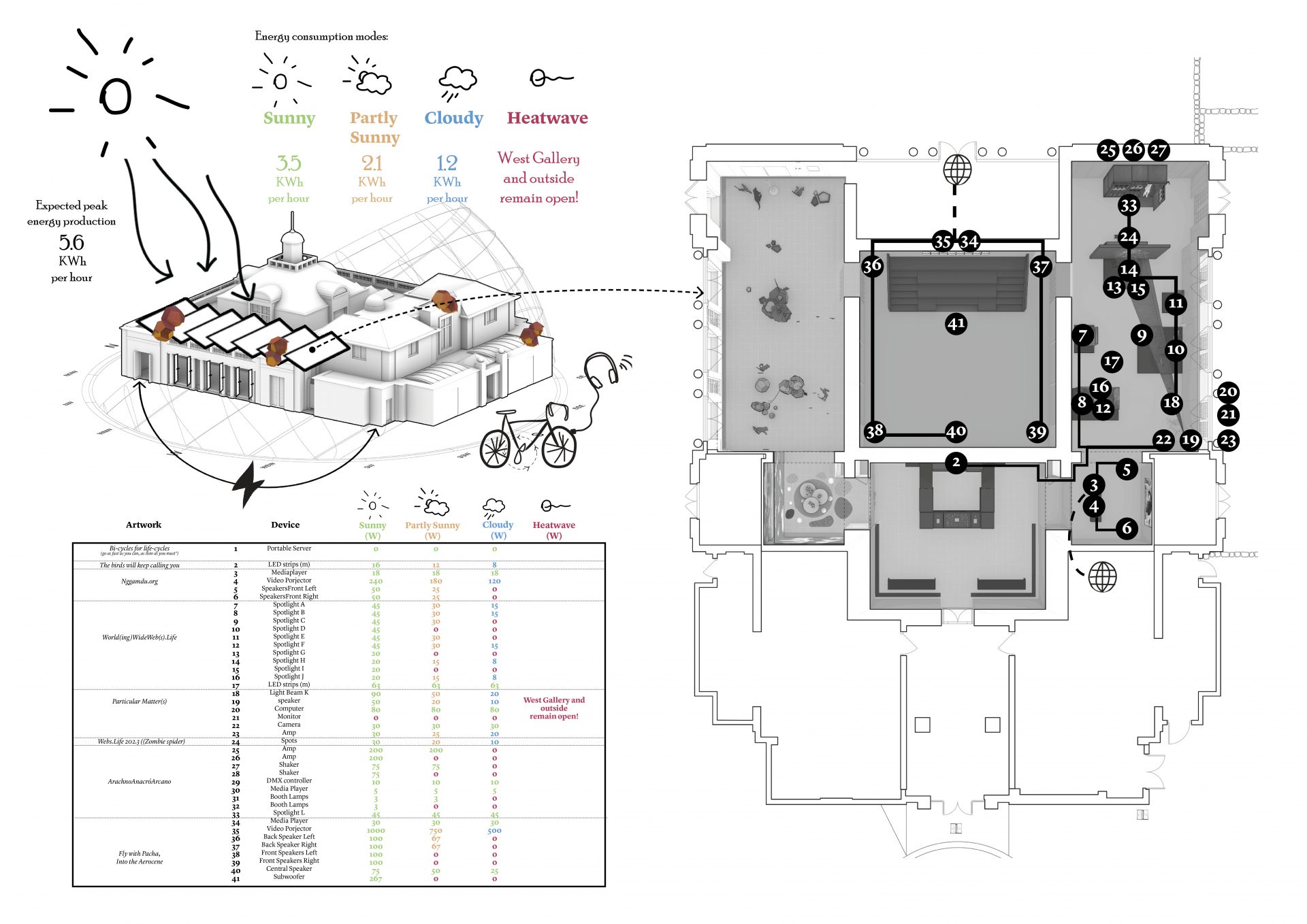 The ability of participants to swing with these rhythms is part of the performance! As such, they are not limitations or inconveniences, but conditions that gesture to our inescapable and necessary connectedness with other beings and places. No energy is clean, but by generating power for the exhibition on site, its various costs—monetary, social, and ecological—become more immediate. We may have gone solar, still we don’t need a night sun to keep the exhibition going, but can produce enough social energy to change power systems. Technology should be world-changing, not world-ending: join us in weather dependency!