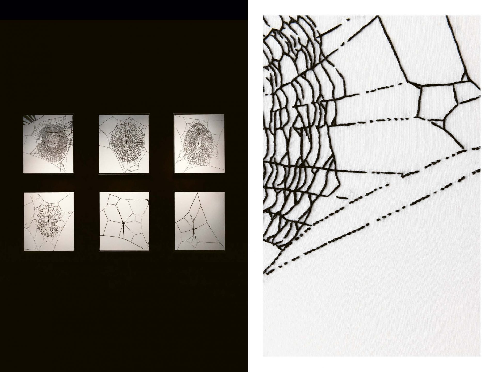 Under the influence of the wasp, the spider weaves highly characteristic webs of a thicker thread and a different pattern than its usual one. Webs.Life 202.3 (Zombie spider) is a series of embroideries based on these mutant webs, which showcase the brutality, sophistication and beauty of an encounter in which one organism benefits at the expense of another. This dynamic abounds in digital spheres – notably across the ‘World Wide Web’, where the few wield the data of the many and is often accepted precisely for its seductive allure. But how do we resist manipulation, and maintain agency? Can you tell the difference between the spider’s own web and that of its zombie kin?